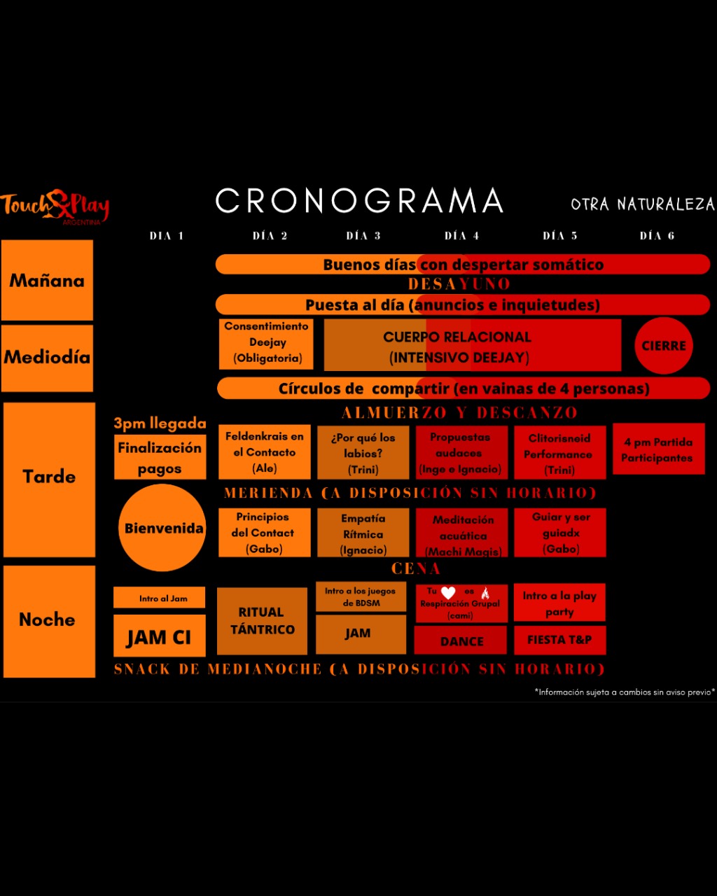 La versión sudamericana de T&P es un encuentro orgánico y en diálogo abierto entre las experiencias situadas de T&P en distintos lugares del mundo. Buscar una otra naturaleza que viene de la colisión entre los saberes y prácticas que viajan y se contagian unas de otras bajo el englobador de Touch&Play. La presencia de DeeJay desde los Estados Unidos, creador de T&P en Otra Naturaleza, trae la potencia de aprender de los hallazgos y desafíos de las ediciones anteriores y adentrarnos de primera mano en el formato original y su presente. La visita desde Cataluña de Trini, complementa esta visión por su trayectoria internacional como profesora de contact improvisation, que fue llevando esta exploración hacia lo sensorial, las emociones y la sexualidad. Trini nos trae también regalos de performance e instalaciones. Nos acompaña tambien Gabo Greca, Nacho Garcia Lizziero, Machi Magis y Ale Karasik de Argentina y Cami Luco (chilena residente en Argentina), que con distintas conexiones con la danza fueron cada une desarrollando sus propias estrategias docentes, fusionándose con el contact improvisation, la osteopatía, el método feldenkrais, la respiración evolutiva, la performance, la educación sexual somática, el aguahara y el tantra. El equipo lo cierran Inge de Holanda e Ignacio de Bolivia, abocades a la contención y el cuidados de les participantes y profes, para brindar apoyo, atención, escucha y acompañamiento individual, y acompañar en la resolución de los conflictos entre dos o más personas. Inga e Ignacio también traen consigo regalos de yoga, masajes, movimiento aunténtico y constelaciones familiares. Por último y más importante, tu presencia y las de les otres participantes que traen sus magias, intenciones, ganas de jugar, de desafiarse y de crecer en el encuentro.